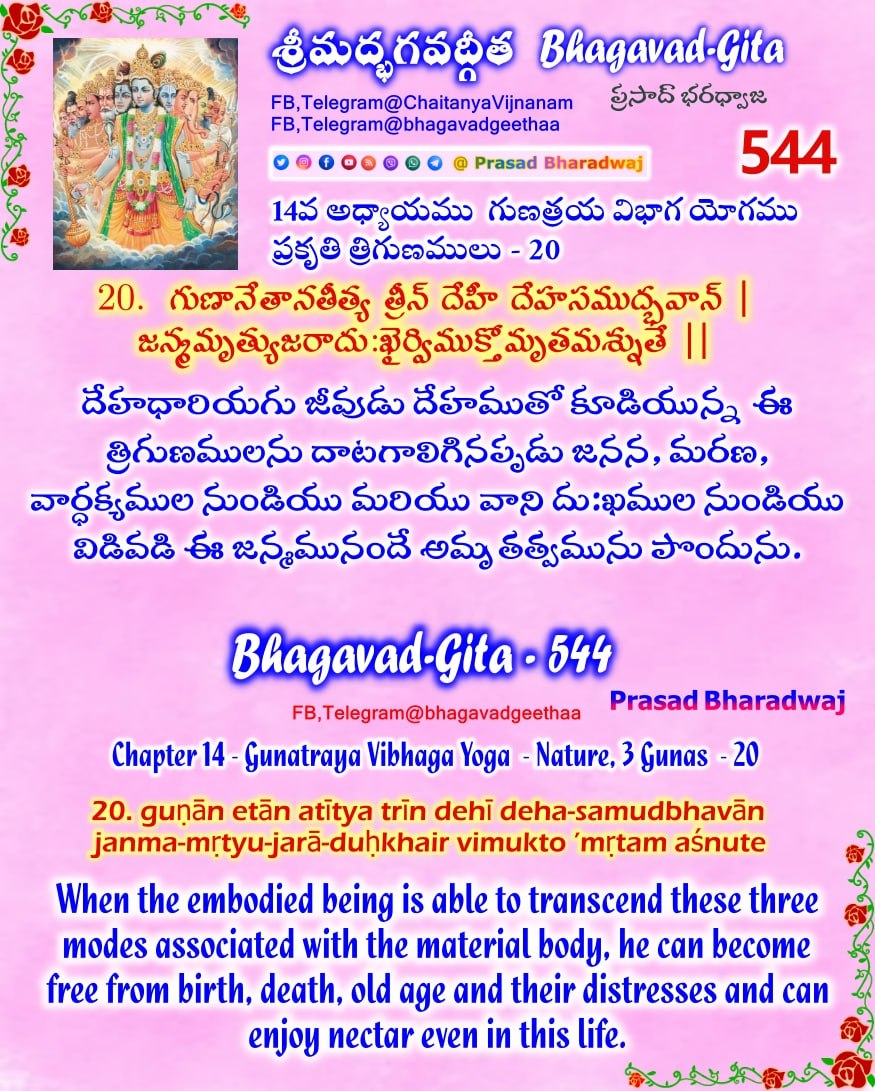 🌷. తాత్పర్యం : దేహధారియగు జీవుడు దేహముతో కూడియున్న ఈ త్రిగునములను దాటగాలిగినప్పడు జనన, మరణ, వార్ధక్యక్యముల నుండియు మరియు వాని దు:ఖముల నుండియు విడివడి ఈ జన్మమునందే అమృతత్వమును పొందును.